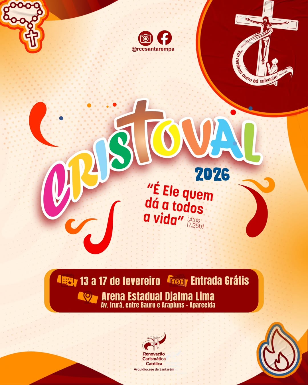 De 13 a 17 de fevereiro a Renovação Carismática Católica (RCC) da Arquidiocese de Santarém promove o Cristoval 2026, na Arena Estadual Djalma Lima, e reunirá fiéis da Igreja local de Santarém para dias intensos de oração, formação, louvor e celebração da fé.